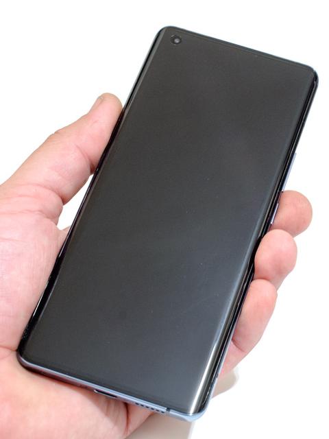 Смартфон следует всем современным трендам – он в меру тонкий, его большой дисплей со скругленными углами занимает почти всю лицевую поверхность и заходит на боковые грани корпуса. Датчик отпечатков пальцев видите? А он есть. Как и маленькая фронтальная камера, он встроен в дисплей. Задняя стенка точно так же скруглена по бокам, её и дисплей разделяет узкая алюминиевая рамка, которая на торцах корпуса "разворачивается" на всю ширину. На дисплее с завода наклеена защитная пленка, которая заходит на загнутые края и со временем начинает на этих краях отклеиваться. Самостоятельно заменить такую пленку будет проблематично.