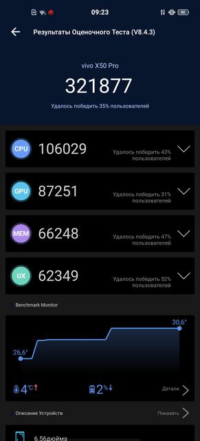 Дисплей у vivo X50 Pro представляет собой AMOLED-матрицу с разрешением FHD+ (2376х1080) и возможностью работы с частотой обновления 90 Гц (по умолчанию установлена стандартная частота 60 Гц, а повышенную можно включить либо вручную, либо автоматически, когда в этом есть необходимость. Настройка цветопередачи дисплея осуществляется выбором из трех готовых вариантов, а также отдельным инструментом можно сделать цвета теплее или холоднее.
