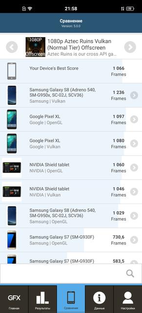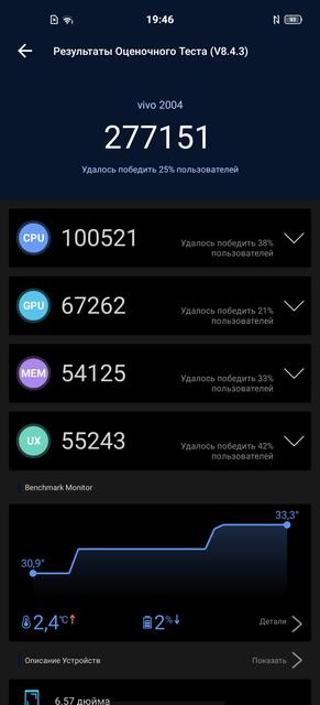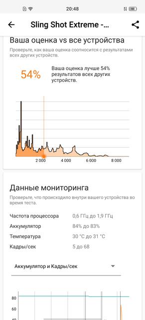 В vivo X50 установлен очень неплохой и энергоэффективный процессор среднего ценового сегмента Qualcomm Snapdragon 730, его вполне достаточно и для быстрой работы приложений/оболочки, и любых современных игр. Хотя стоит отметить, что в данной ценовой категории есть модели со Snapdragon 855/855+/865. Но вернёмся к начинке vivo X50. Qualcomm Snapdragon 730 — 8-нанометровый процессор с двумя высокопроизводительными ядрами Kryo 470 Gold с тактовой частотой 2.2 ГГц и шестью энергоэффективными Kryo 470 Silver с частотой 1.8 ГГц. Графический ускоритель — Adreno 618 с тактовой частотой 825 МГц. Оперативной памяти в смартфоне 8 ГБ LPDDR4X. Единственный малоприятный момент — 128 ГБ встроенной памяти без возможности расширения. Результаты в синтетических тестах вполне соответствуют современному смартфону среднего ценового сегмента.