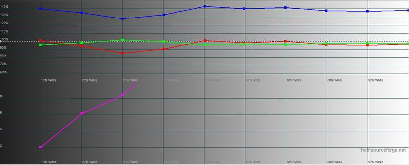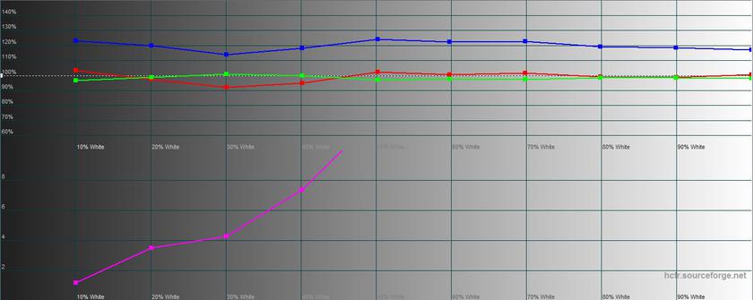 В "нормальном" режиме переизбыток синего значительно меньше, картинка ближе к естественной. При этом, максимальная яркость практически не отличается: 459.067 кд/м².
