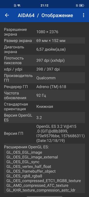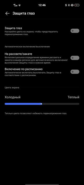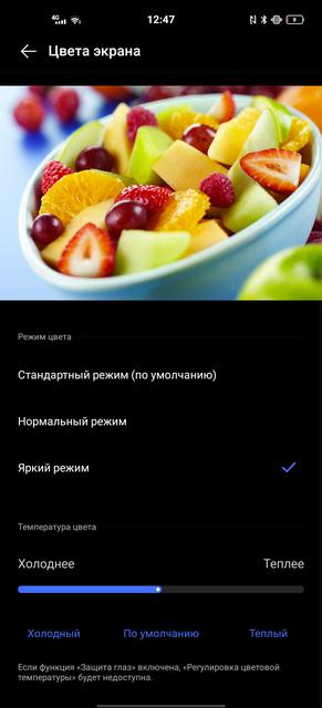 В смартфоне установлен плоский 6.56-дюймовый AMOLED. Разрешение составляет FullHD+, в данном случае это 2376х1080, пиксельная плотность составляет около 398 ppi. Обещают цветовой охват DCI-P3, есть поддержка HDR10+. Частота опроса сенсора — 180 Гц, а частота обновления картинки — 90 Гц. Частоту можно выбирать между 60 и 90 Гц или включить адаптивный режим. Хотя не вижу особого смысла в этом: экономия заряда минимальная, так что можно смело ставить 90 Гц и не беспокоиться. Набор настроек привычный. Присутствует тёмная тема интерфейса с возможностью регулировки фона от чёрного то серого (странная опция, но она есть), режим защиты зрения с возможностью автоактивации по расписанию и функция снижения мерцания (DC Dimming). Есть три режима отображения цветов: "стандартный", "нормальный" и "яркий", присутствует возможность ручной регулировки цветовой температуры.