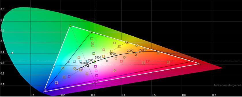По личным впечатлениям, экран очень хорош: цвета очень насыщенные, с солнцем справляется без проблем, углы обзора максимальные. При этом, типичных для AMOLED-экранов зеленоватых оттенков под углом практически нет. В "ярком" режиме максимальная яркость составила 464.169 кд/м². Цветовой охват значительно шире sRGB, похоже на обещанный DCI-P3. При этом, цветовая температура ощутимо выше эталонной, экран уходит в холодные оттенки. Но в настройках можно подкорректировать вручную. Приблизительно аналогичные показатели экран демоснтрирует и в "Стандартном" режиме: