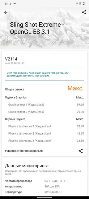 Snapdragon 888+, как и его младший брат Snapdragon 888 — весьма горячие процессоры и во многих моделях бывают из-за этого серьёзные проблемы с производительностью. В данном случае CPU Throttling Test показал, что производительность может падать до 84%, что является очень неплохим показателем для данного процессора. Корпус нагревается, но в разумных пределах, руки не обжигает.