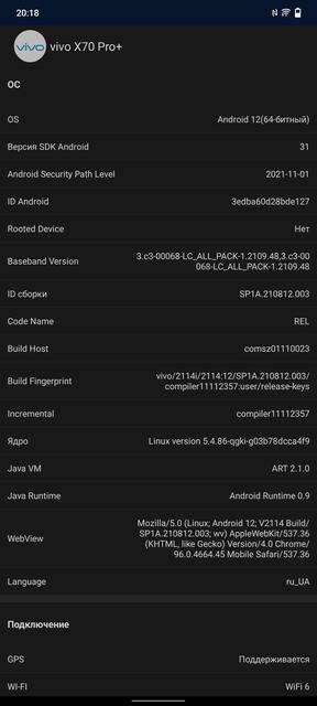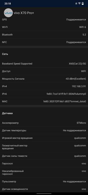 Набор средств биометрической идентификации абсолютно стандартный по современным меркам. Распознавание лица с помощью фронтальной камеры: работает очень быстро при условии хорошего освещения. И подэкранный сканер отпечатков пальцев. Он оптический и во время распознавания подсвечивает палец. Минус данной технологии в том, что мокрые пальцы распознаются с трудом. Сканер vivo X70 Pro+ — не исключение. В остальном претензий к нему нет: работает точно и по скорости практически не уступает классическим сканерам не-в-экране.