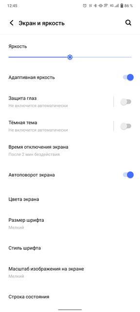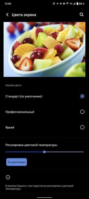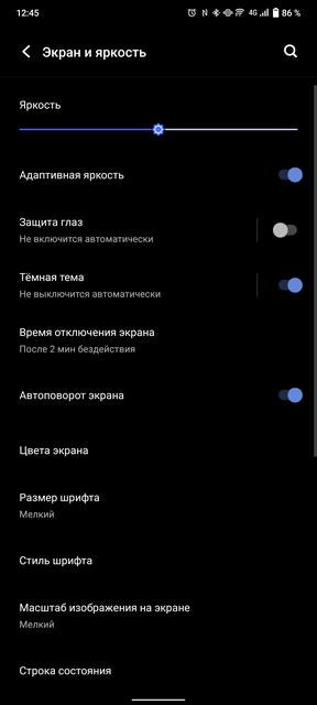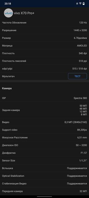 В vivo X70 Pro+ установлен внушительных размеров 6.78-дюймовый изогнутый 10-битный AMOLED-дисплей, выпускаемый по LTPO-технологии. Благодаря этому возможна плавная регулировка кадровой частоты от 1 до 120 Гц в зависимости от контента. Это, в том числе, позволяет несколько снизить энергопотребление. Дисплей имеет разрешение 3200х1440, пиксельную плотность 517 ppi и соотношение сторон 20:9. Обещают максимальную яркость в ручном режиме 500 кд/м2, в автоматическом режиме 1000 кд/м2 и пиковую 1500 кд/м2. Разумеется, экран отображает 1 млрд цветов и поддерживает стандарт HDR10+. В настройках есть практически весь стандартный набор возможностей. Включая тёмную тему интерфейса, режим защиты глаз, настройку масштаба, размера шрифта, разрешения, частоты обновления и разных режимов цветопередачи. Нет разве что DC Dimming. Есть вероятность, что она активна постоянно, но подтвердить или опровергнуть возможности нет. Мои глаза не подвержены какому-либо влиянию мерцания.