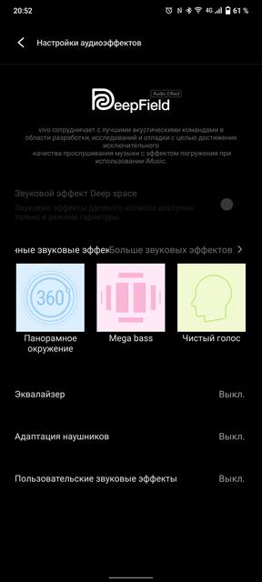 Смартфон умеет воспроизводить стереозвук и поддерживает Dolby Atmos. На деле же звук нельзя назвать поражающим воображение, как по качеству, так и по громкости. На рынке есть модели сильнее в этом плане. Разъёма 3.5 мм в смартфоне нет, есть поддержка кодеков aptX HD, aptX Adaptive и LDAC. В фирменном плеере, помимо стандартного набора функций, есть раздел DeepField с дополнительными функциями. Включая виртуальный звук 360°, эквалайзеры, улучшайзеры и так далее.