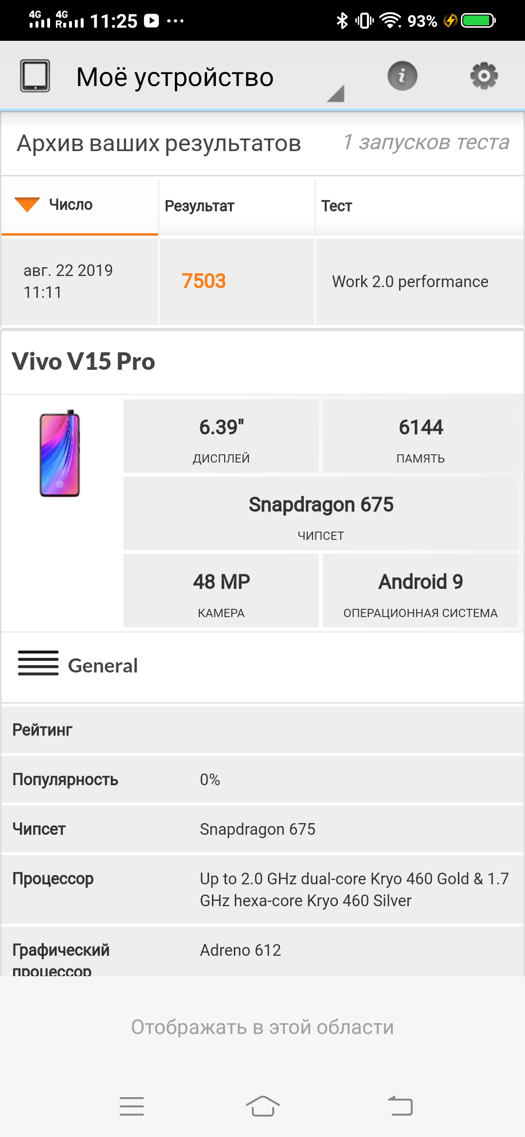 Vivo V15 Pro оснащен процессором Qualcomm 675 и 6 ГБ оперативной памяти, объем встроенной составляет 128 ГБ. Для своей ценовой категории это не царские характеристики. У той же Xiaomi есть минимум две модели с процессорами Qualcomm 800-й серии. Эта модель работает стабильно и быстро, мне было комфортно пользоваться. Процессор выполнен по 11-нм техпроцессу, но, как я уже писала выше, бывают устройства с лучшей оптимизацией ПО, которые меньше расходуют заряд аккумулятора. Чипсет считается геймерским - для тех, кому нужна мощная графика, но денег на топовый смартфон нет.