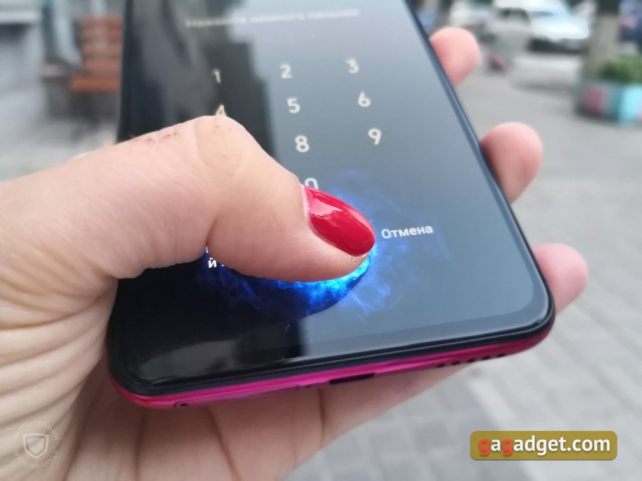 Сканер под экраном работает быстро и точно, у меня за все время, может, два раза смартфон заартачился разблокироваться с первого раза. Иногда, если нажимала с недостаточной силой, предупреждал, что надо давить сильнее. На темном экране сканер не видно, но стоит прикоснуться к смартфону и он появляется.