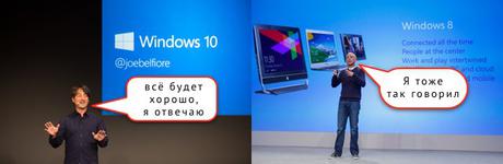 В заключение можно глянуть на преисполненного оптимизма Джо Бельфиора, который с огромным энтузиазмом представляет возможности новой Windows 10. Впрочем, мы все знаем, что он уже с тем же энтузиазмом представлял откровенно слабые продукты, поэтому веры ему уже нет, но умирающая после того, как показали титры и все вышли из зала, надежда, еще есть. Ведь релиз Windows 10 запланирован аж на конец 2015 года, поэтому еще многое можно изменить. Хотя все требования сводятся к одной простой идее: спрячьте к черту планшетный интерфейс в Windows и не показывайте его никак по умолчанию.