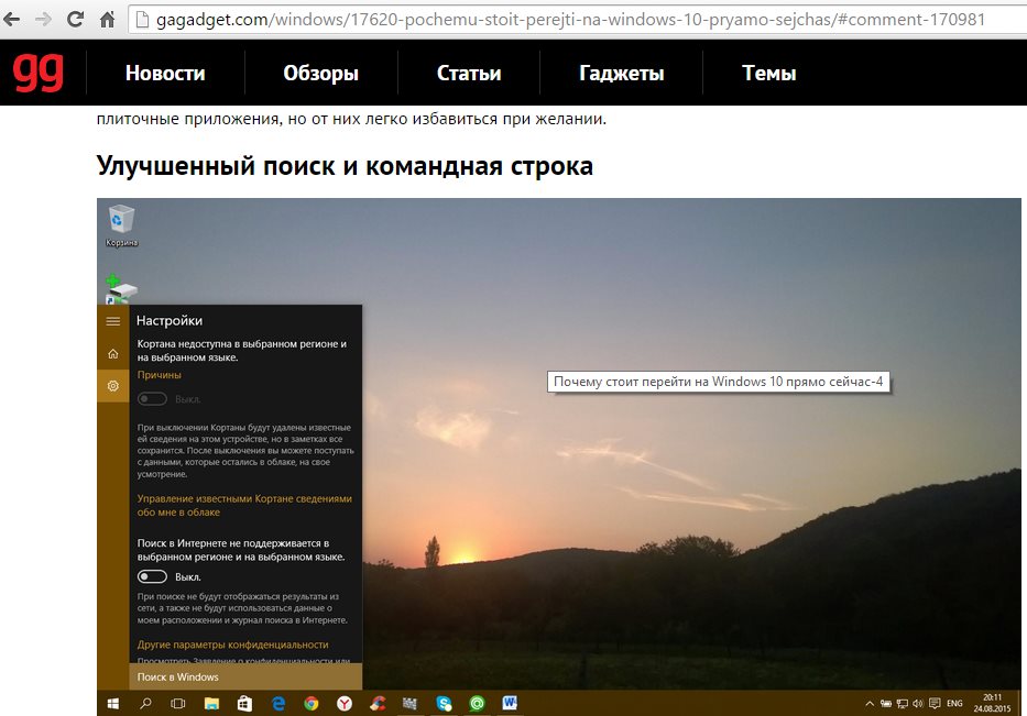 Очень порадовал улучшенный поиск, который обещает ещё преобразиться с появлением Cortana. Сейчас намного легче найти приложение или программу в компьютере, добраться до определенной настройки параметров. Порадовала также возможность вставлять скопированный файл в командную строку, реально облегчив работу в ней.