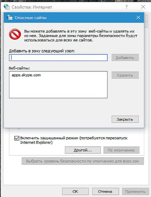 - Далее в открывшемся окне в верхнее текстовое поле пишем apps.skype.com и нажимаем Добавить. После чего нажимаем кнопку Закрыть и подтверждаем свое действие нажав на ОК.