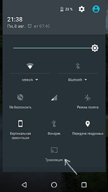 Важно, чтобы и компьютер и устройство были подключены к одной и той же сети Wi-Fi. После этого в шторке уведомлений нажмите по значку «Трансляция».