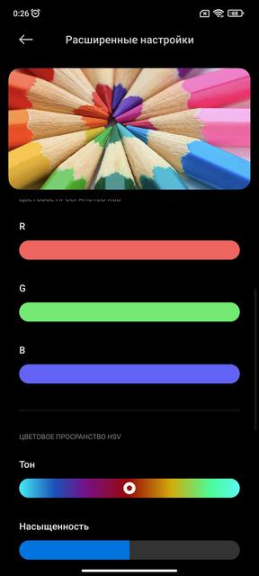 Экран у смартфона очень приятный, как по цветопередаче, так и запасу яркости. Углы обзора максимальные, но под определёнными углами наблюдается зеленоватый оттенок, что свойственно большинству AMOLED/ В "Насыщенном" режиме максимальная яркость составила очень 493.872 кд/м2, а цветовой охват значительно шире стандартного sRGB. Но есть переизбыток синего и минимальный недостаток красного. В результате чего картинка уходит в холодные оттенки. Благо это поправимо с помощью ручных настроек.