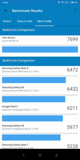 Все смартфоны линейки получали флагманские процессоры Qualcomm, так что в Xiaomi Mi Mix 2S установлен конечно же топовый Qualcomm Snapdragon 845. Мы уже использовали немало смартфонов на этой платформе, так что всё ожидаемо: максимальная производительность и в приложениях, и в играх с тяжёлой графикой. Оболочка Xiaomi Mi Mix 2S летает (стоит ещё сказать, что её очень толково оптимизировали), все игры идут отлично. Оперативной памяти в нашей конфигурации — 6 ГБ LPDDR4X, в топовой — 8 ГБ. Хотя не уверен, что она у нас будет продаваться: