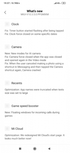 Речь идёт о глобальной стабильной версии с номером сборки v10.3.5.0.PFGMIXM. Прошивка весит около 600 МБ. В ней разработчики Xiaomi улучшили качество фотографий, добавили новые режимы съёмки c функциями ИИ, всплывающее поверх окон уведомление звонка в игровом режиме Game Booster, а также мартовский патч безопасности. Кроме этого, в новой прошивке исправили множество ошибок предыдущей версии. Полный список изменений представлен на скриншотах ниже.