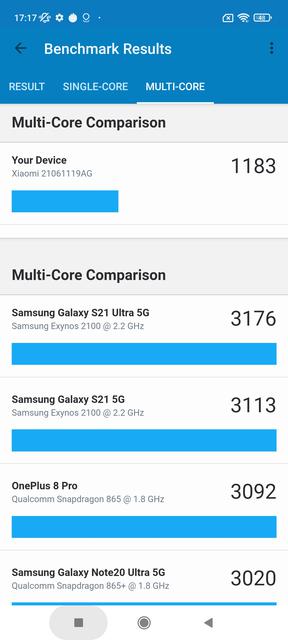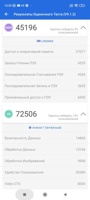 Redmi 10 можно отнести к «продвинутому начальному классу» смартфонов. То есть, он достаточно мощный, чтобы не напрягать тормозами среднестатистического пользователя. Чипсет MediaTek Helio G88 имеет шесть ядер Cortex-A55, работающих на частоте 1,8 ГГц и еще два ядра помощнее, Cortex-A75 на 2 ГГц. В роли графического процессора используется Mali-G52 MC2. В тестах картина предсказуемая, оценки низкие. В повседневной работе у потенциального обладателя такой модели проблем не будет, интерфейс работает отзывчиво, да и в простые игрушки поиграть вполне можно.