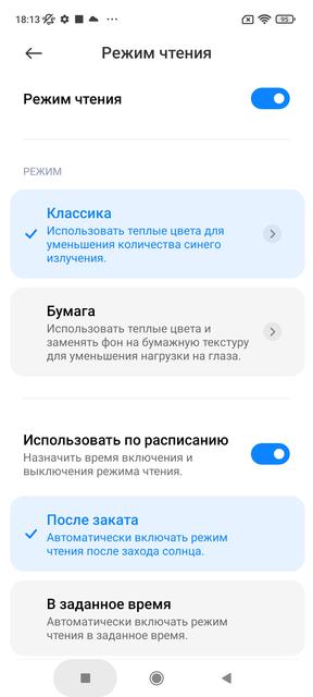 Дисплеи с разрешением меньше, чем FullHD, сейчас остались только в самом дешёвом сегменте. Redmi 10 всё же покруче, здесь разрешение взрослое, 1080х2400, да и частота обновления 90 Гц вполне в тренде. При желании в настройках можно ограничить её 60 герцами для экономии энергии. Там же предлагается настроить цветовую схему, цветовой тон, включить режим чтения или темную тему. И то и другое активируется как вручную, так и по расписанию.