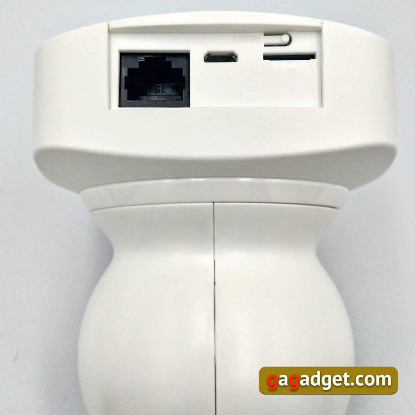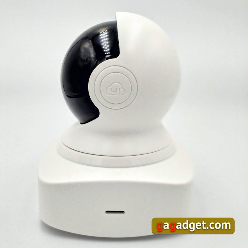 Белоснежный скафандр космонавта с непрозрачным черным забралом-шлемом. Вот первые впечатления о камере, как только она попадается кому-то на глаза. И действительно: корпус мог бы с успехом играть роль в каком-нибудь космическом триллере — главное, не показывать тело этого космонавта ниже плеч. А там — вполне обыкновенная платформа с креплениями, на этой прямоугольной площадке размещены микрофон (спереди) и коммуникационные отверстия сзади (подключение питания, разъем RJ45 для проводного интернета, слот для карты памяти и кнопка сброса). По бокам прямоугольного постамента есть отверстия динамиков для звуков, который издает камера.