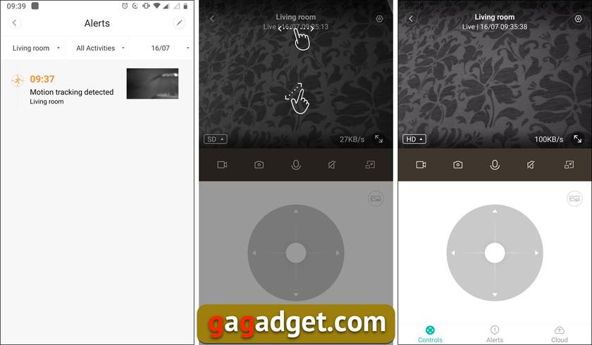 Камера может вращать своей головой на 360 градусов и наклонять и поднимать объектив на 102 градуса. При движении моторчиков вообще не слышно, и они точно не смогут разбудить вашего ребенка или кота, или спугнуть домушников. А против них эта камера вполне эффективна: в неё встроен трекинг движущегося объекта, то есть, она может следить за проходящим мимо человеков, автоматически поворачиваясь за ним. Конечно, на быстрое движение она реагирует не мгновенно, но все же если вы спокойным шагом проходите мимо, то в любом случае останетесь в кадре — она проследит за двигающимся объектом, если он один. Если объектов больше, камера не поймет, за кем следить, и будет поворачиваться за тем, кто находится ближе к сенсорам. Камера может двигаться на 360 градусов, охватывая все, что вокруг. Она даже умеет делать панорамные фото, отправляя их потом вам в телефон, или же управляться с вашей стороны — в приложении есть большие кнопки вращения камеры в нужном направлении, шаг приводов маленький и достаточный для того, чтобы точно настроить позицию камеры.