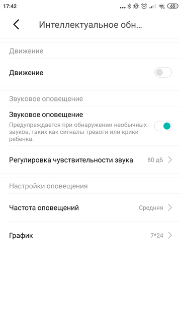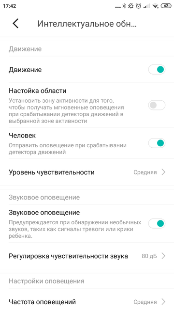 В разделе «планирование» можно назначить график автоматического включения и выключения камеры с возможностью повтора по выбранным дням недели. В настройках интеллектуального обнаружения есть, собственно, выключатель самого детектора движения, настройка области, за пределами которой движения не будут распознаваться, а также режим определения человека. По идее, если его включить, камера не будет реагировать на домашних животных или другие неантропоморфные объекты. Именно эта функция и скрывается за вынесенной в название устройство конструкцией AI+. То бишь, определением человека занимается не иначе как искусственный интеллект. Уровень чувствительности срабатывания тоже настраивается. Второй вариант срабатывания камеры — обнаружения звука. Тут можно включить или выключить эту функцию, а также настроить порог чувствительности в децибелах.