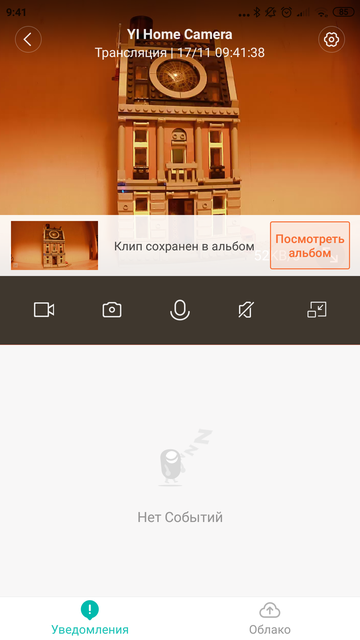 Все настройки камеры выполняются через приложение YI Home, оно существует как для мобильных, так и для десктопных платформ. Главный экран программы отображает переключатель режима «дома»/«нет на месте», подключенные камеры, а также рекламу облачного сервиса и датчиков Kami Smart Kits. Нажав на камеру, мы попадаем на ее основную страницу, где можно увидеть картинку с камеры и список зарегистрированных событий.