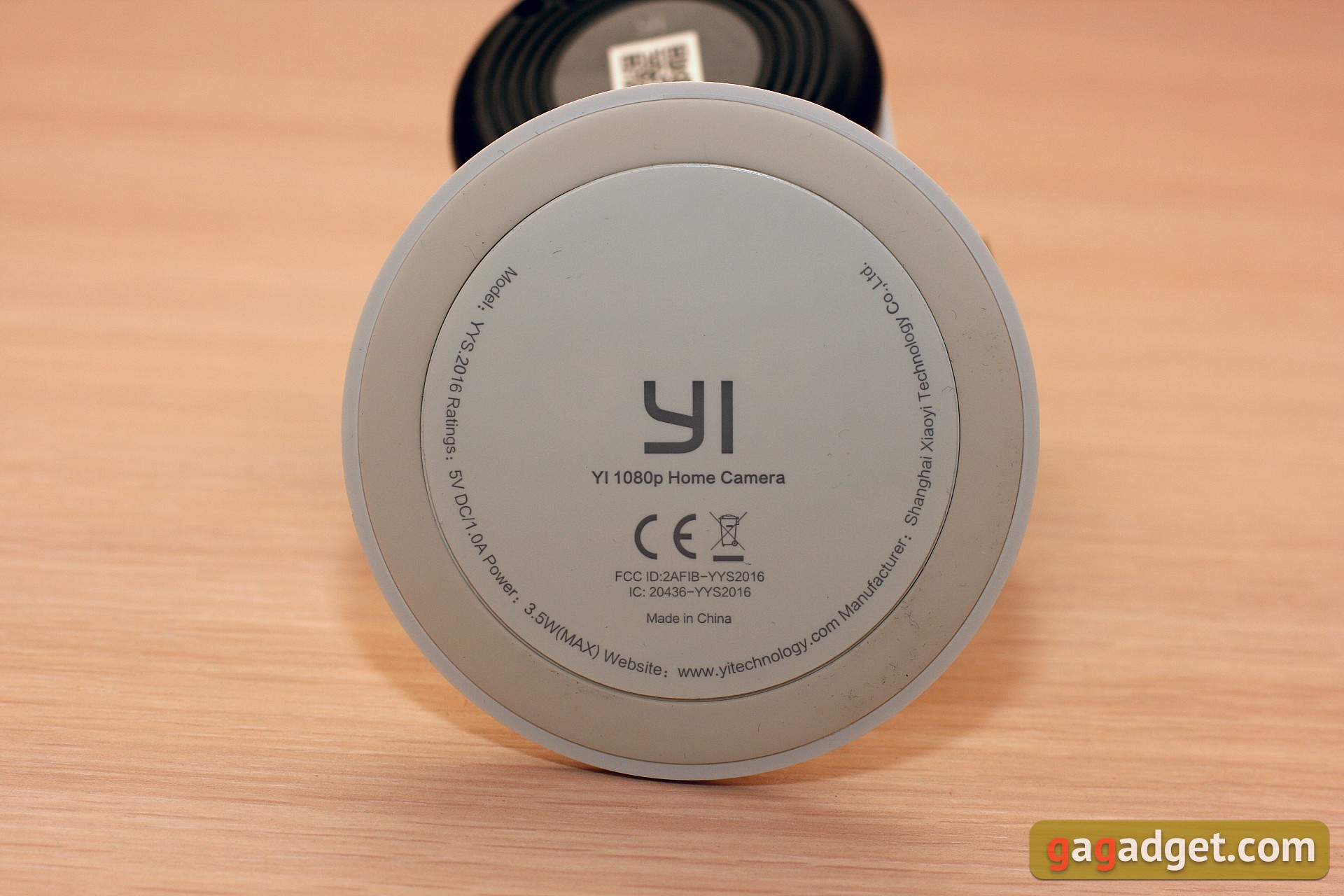 Белая часть корпуса (рамка-подставка) — матовая. Спереди под камерой логотип YI. На «донышке» — прорезиненное кольцо для устойчивости и круглая наклейка с информацией о продукте. Шарнир очень приятный, работает без малейшего скрипа, надежно фиксирует камеру, допуская при этом более 180 градусов регулировки.