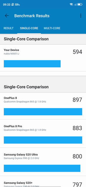 В смартфоне установлен далеко не новый процессор среднего ценового сегмента Qualcomm Snapdragon 765G, который анонсировали в конце 2019 года. Но он получился вполне удачным. Да и в целом, процессоры Snapdragon среднего сегмента очень неплохо справляются с тяжёлыми играми, не говоря уже об оболочке и приложениях. Snapdragon 765G производится по 7-нм техпроцессу и включает в себя 8 ядер: 1хKryo 475 Prime с частотой 2.4 ГГц, 1хKryo 475 Gold с частотой 2.2 ГГц и 6 энергоэффективных ядер Kryo 475 Silver с частотой 1.8 ГГц, за графику отвечает ускоритель Adreno 620. Есть поддержка 5G, которая пока не актуальна для нас. Оперативной памяти — 8 ГБ, встроенной — 128 ГБ. Существует версия на 256 ГБ, слота MicroSD нет, как мы уже писали ранее. В бенчмарках смартфон демонстрирует очень неплохие цифры, вполне ожидаемые для смартфона среднего сегмента.