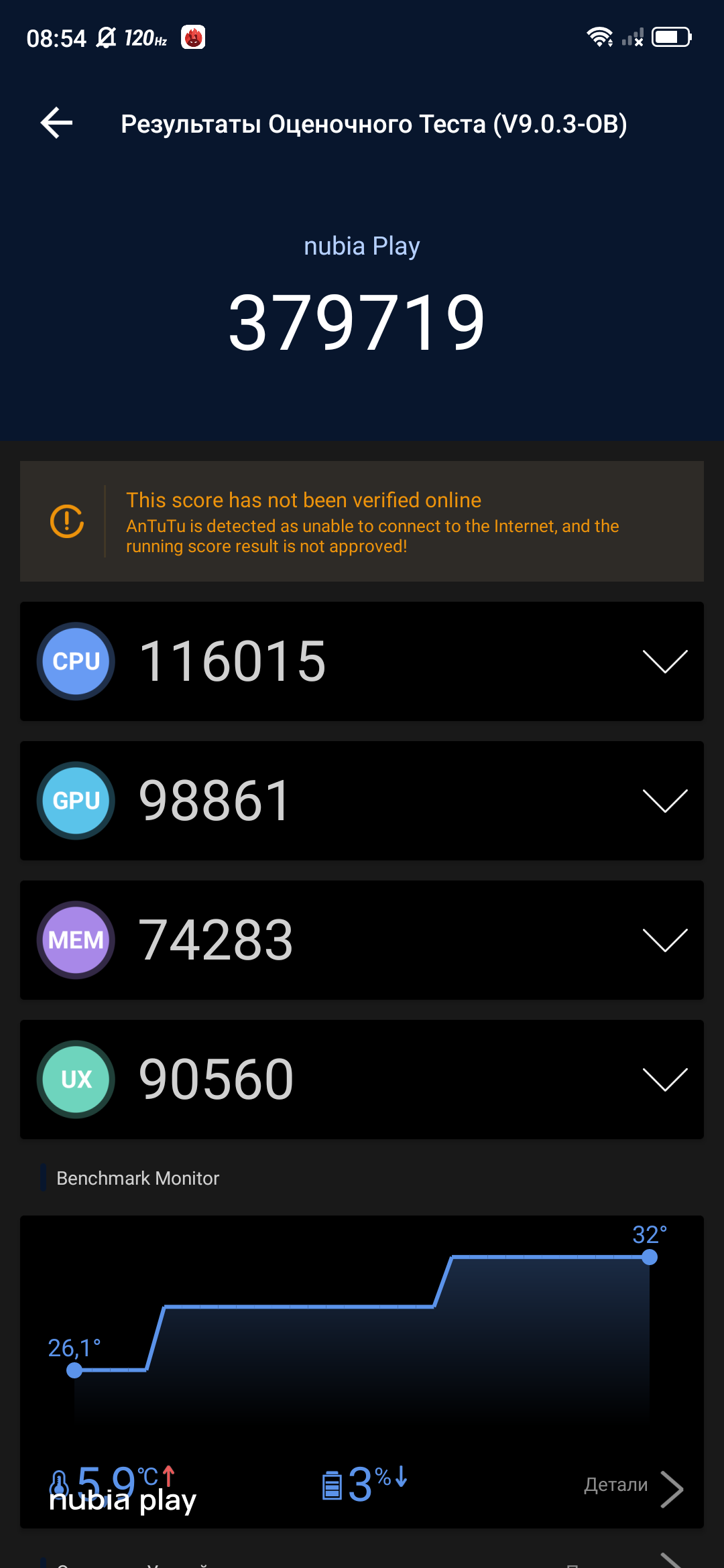 CPU Throttling Test, показал, что при длительных пиковых нагрузках производительность может снижаться до 93%. В пределах нормы. Сам смартфон немного нагревается только если включить режим максимальной производительности и поиграть некоторое время.