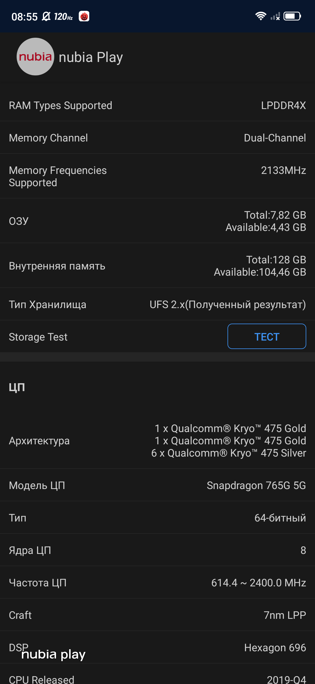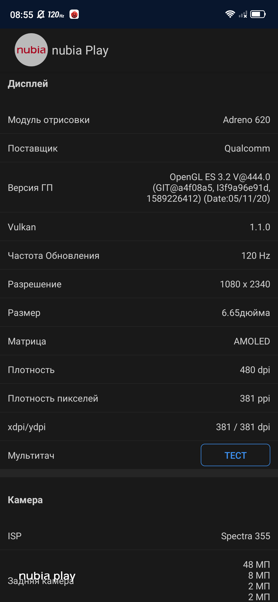 В ZTE Nubia Play используется AMOLED-дисплей с диагональю 6.65 дюйма с соотношением сторон 19.5:9 и разрешением FullHD+ (2340х1080 точек). Плотность пикселей составляет около 388 ppi. Частота обновления экрана составляет 120 Гц, частота опроса сенсора — 240 Гц, а задержка — 8.3 мс. Всё это должно (теоретически) сделать игру на смартфоне более комфортной. Да и списки, ленты новостей, социальных сетей и прочего с частотой 120 Гц выглядят значительно приятнее и плавнее. Визуально экран произвёл очень хорошее впечатление. Как по качеству картинки, углам обзора, так и по запасу яркости. Под определённым углом на белом появляется лёгкий голубоватый оттенок. Довольно распространённая особенность AMOLED. Хотя преимущественно белый цвет становится зеленоватым.